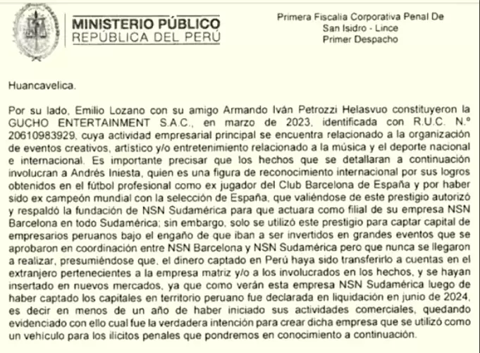Las diligencias fiscales iniciaron tras una denuncia presentada por la empresa Gucho Entertainment S.A.C. y otros empresarios peruanos, quienes aseguran haber invertido alrededor de 600 mil dólares en proyectos promovidos por NSN Barcelona, compañía de la que Iniesta figura como propietario, y su filial sudamericana NSN Sudamérica.