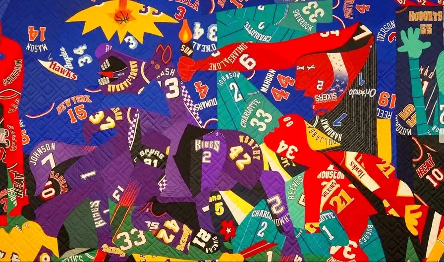 Sin embargo, lo que más destaca al entrar a la exposición es un enorme tapiz conformado por decenas de camisetas de equipos de la NBA que versiona el Guernica de Pablo Picasso.