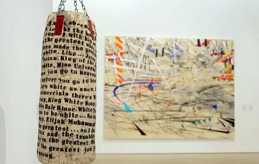 Otras obras incluyen una armadura de fútbol americano que simula ser la cabeza de un caballo, varias deportivas ‘Air Jordan’, un inmenso cuadro de Allen Iverson conformado por centenares de pulseras de microcuentas, o una obra que rememora la ‘batalla de los sexos’ librada en 1973 entre Bobby Riggs y Margaret Court.