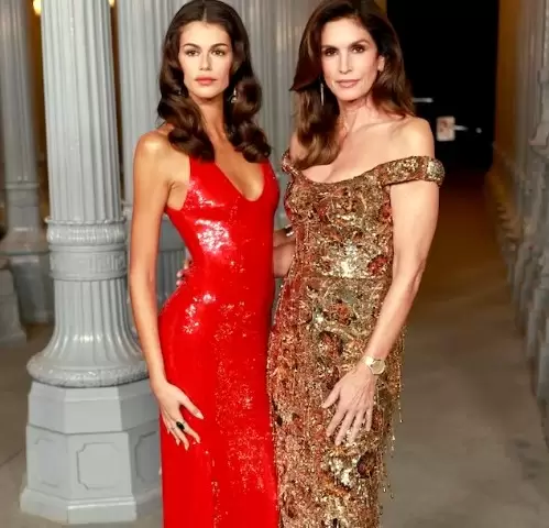 Madre e hija han compartido alfombra y una misma elegancia. Kaia, actriz y modelo, ha deslumbrado con un vestido rojo de lentejuelas; Cindy, icono absoluto de los noventa, ha apostado por un diseño dorado brillante.