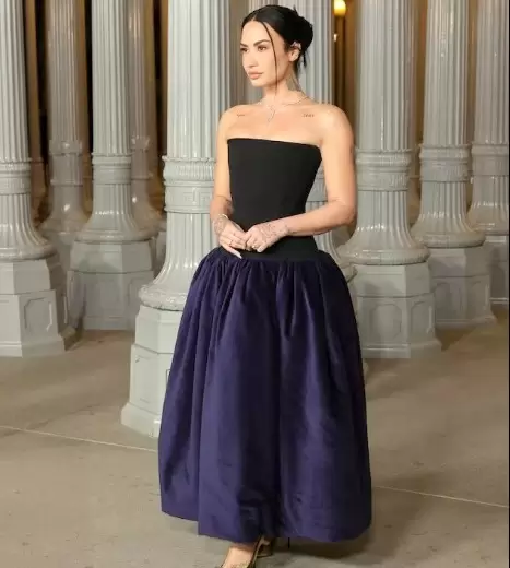 La cantante y actriz, que acaba de lanzar su versión rockera de Heart Attack, ha apostado por un diseño palabra de honor en negro y azul marino con falda voluminosa. Ha completado el look con joyas de James Allen. (Agencias)