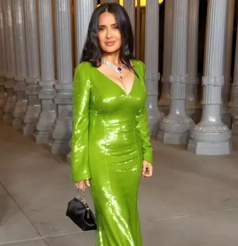 Salma Hayek: La actriz deslumbró con un vestido de lentejuelas en color verde de Gucci, que combinó con un bolso negro.