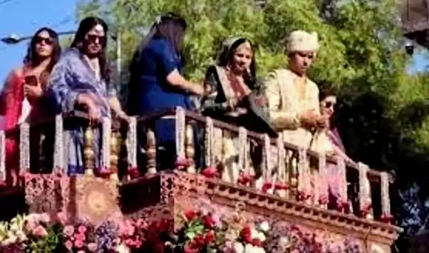 En un vídeo del momento de la ceremonia puede verse a la pareja montada junto a un grupo de personas sobre una carroza decorada tirando billetes, ropa y bolsas con pertenencias a un grupo de personas que asoman sus manos para recoger todo cuanto cae sobre sus cabezas.